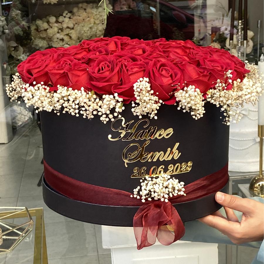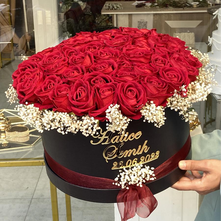 Bukette 41 adet kadife yapay gül vardır . Uzun ömürlüdür . Lütfen açıklama kısmına isim ( gelin&damat ) ve tarihinizi belirtiniz.