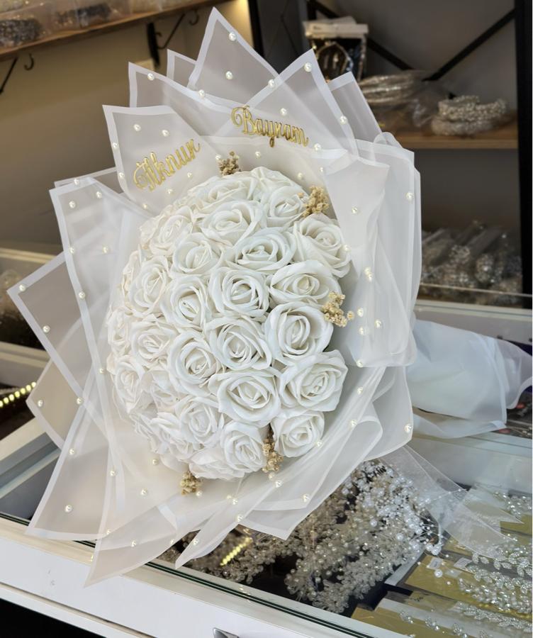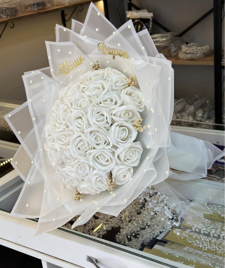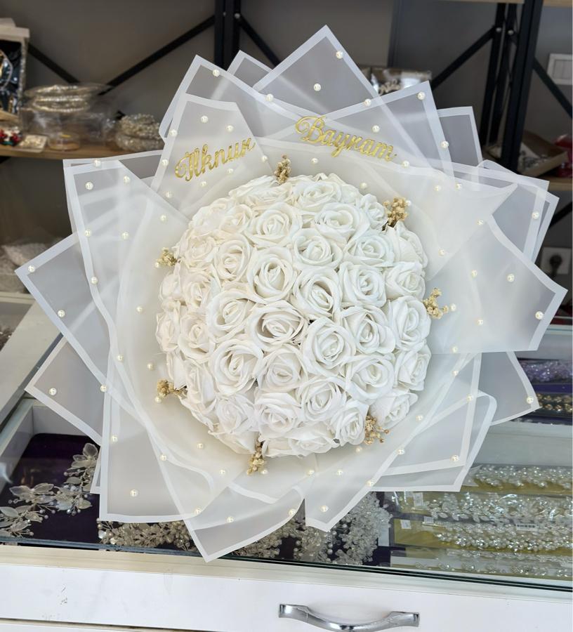İsteme çiçeğinde 30 adet kadife dokulu gül vardır. Kişiselleştirmek için lütfen bizimle whatsaptan iletişime geçiniz