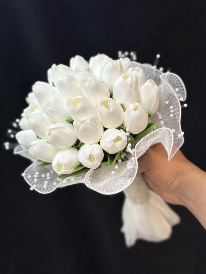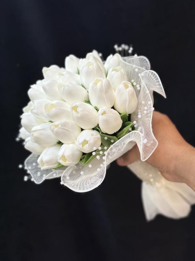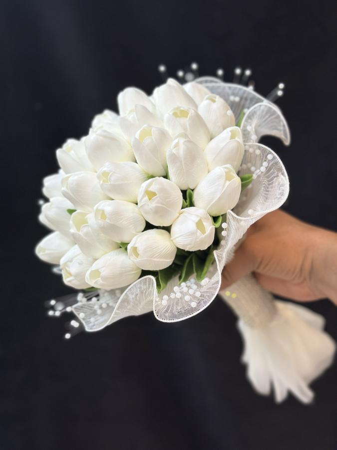 25 adet ıslak lale ile hazırlanmıştır . Damat yaka çiçeği hediyemizdir , tek bir adet incili laleden yapılmaktadır.