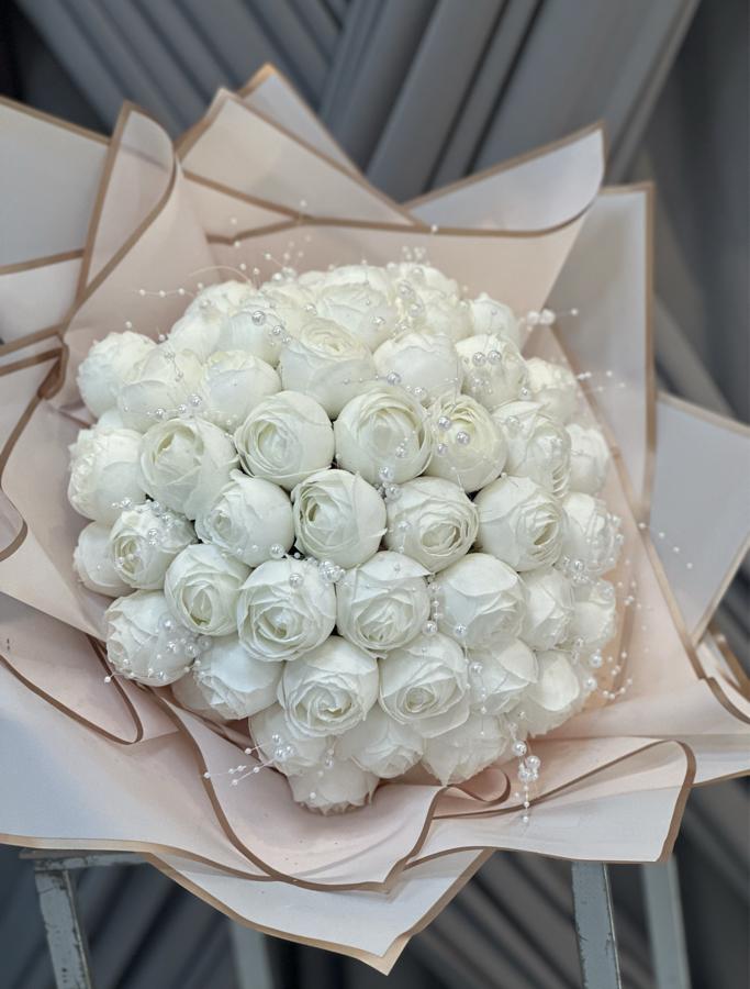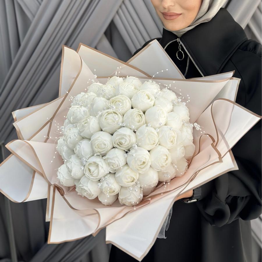 Tamamen yapay çiçeklerden yapılmıştır . Elde görseldeki gibi tok ve dolu durur . Uzun ömürlüdür. 41 adet şakayık kullanılmıştır .