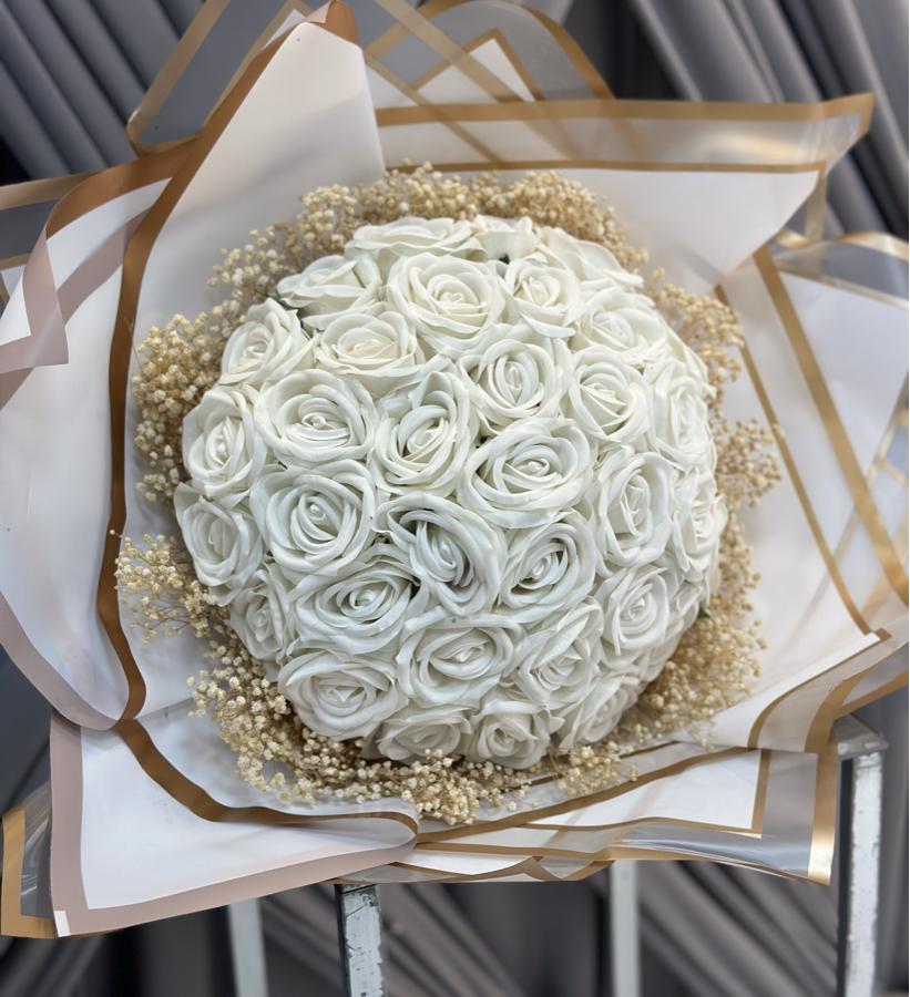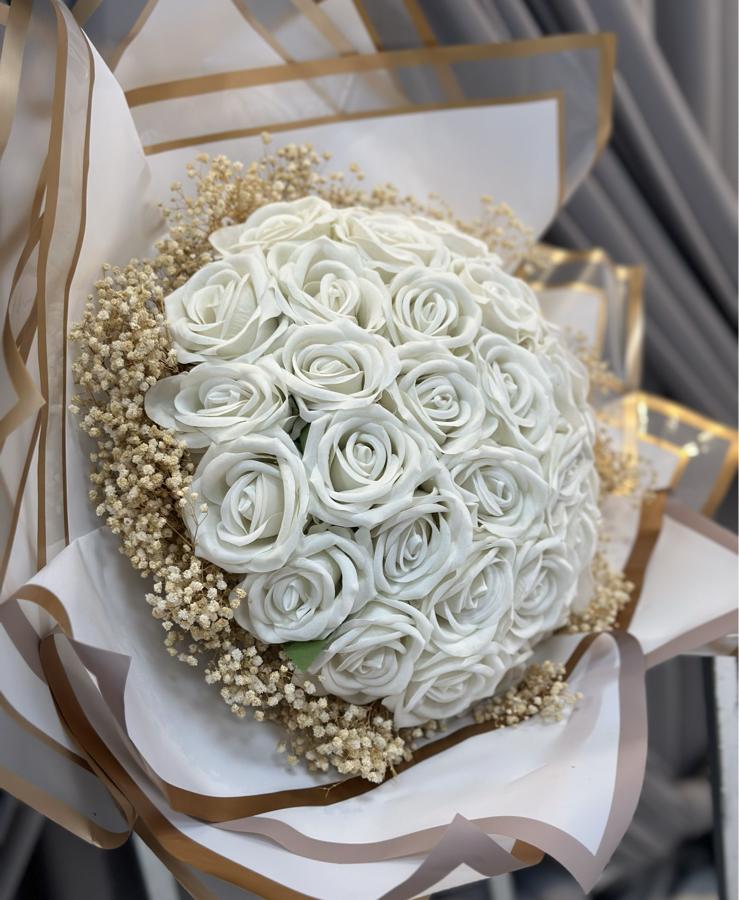 Yapay ve kuru çiçeklerden hazırlanmıştır . Elde görseldeki gibi tok ve dolu durur . Uzun ömürlüdür. 35 adet gül kullanılmıştır