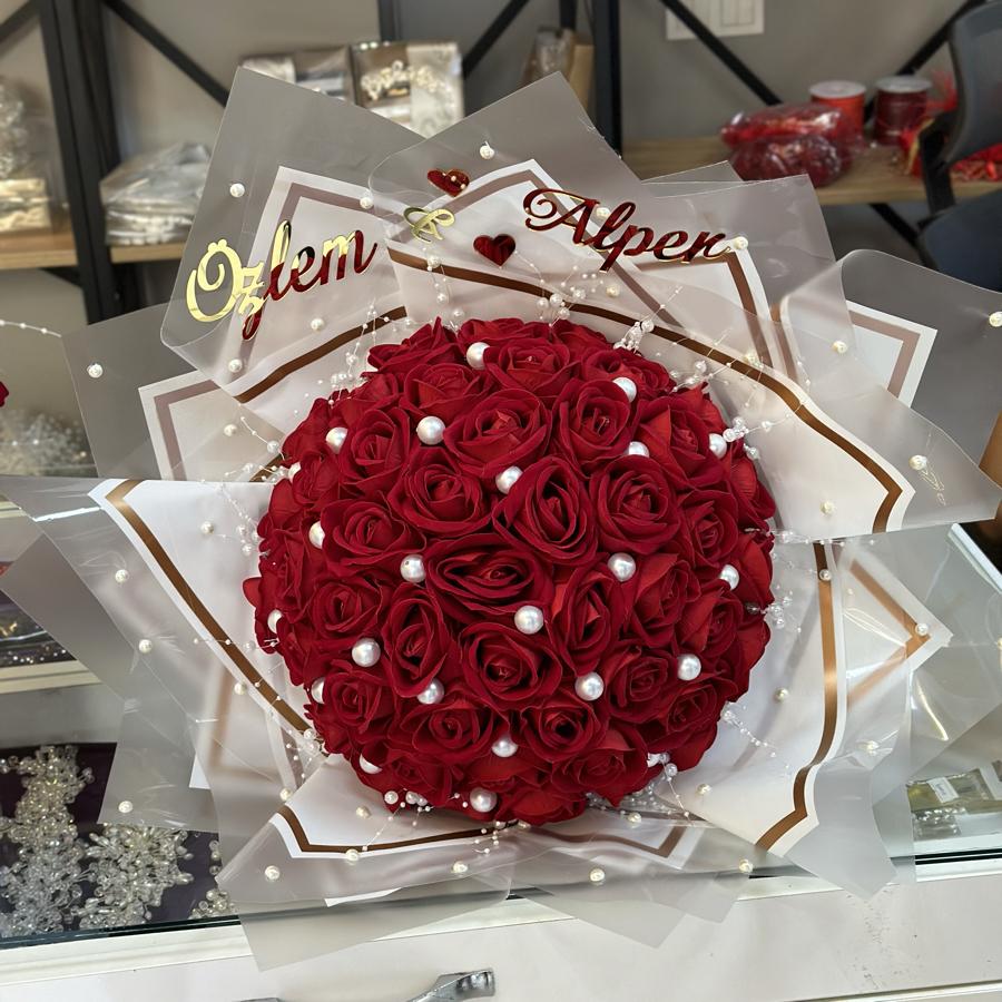 Bukette 50 adet solmayan kırmızı yapay gül vardır . Fotoğrafta göründüğü gibi birebir gelmektedir .