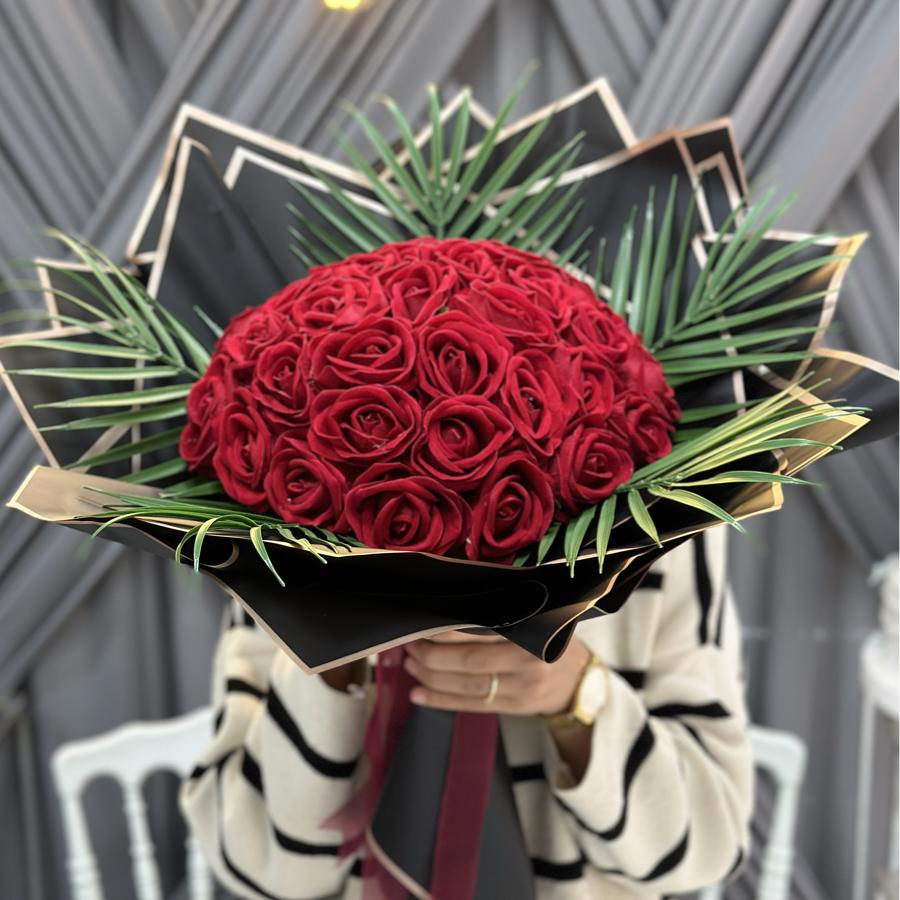 35 adet kadife dokulu yapay güllerden yapılmıştır . Uzun ömürlüdür .