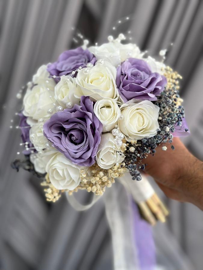 Yapay ve kuru çiçeklerden hazırlanmıştır . Elde görseldeki gibi tok ve dolu durur . Uzun ömürlüdür. 20 adet Gülden yapılmıştır .Damat yaka çiçeği hediyemizdir .