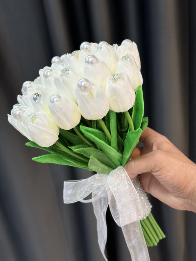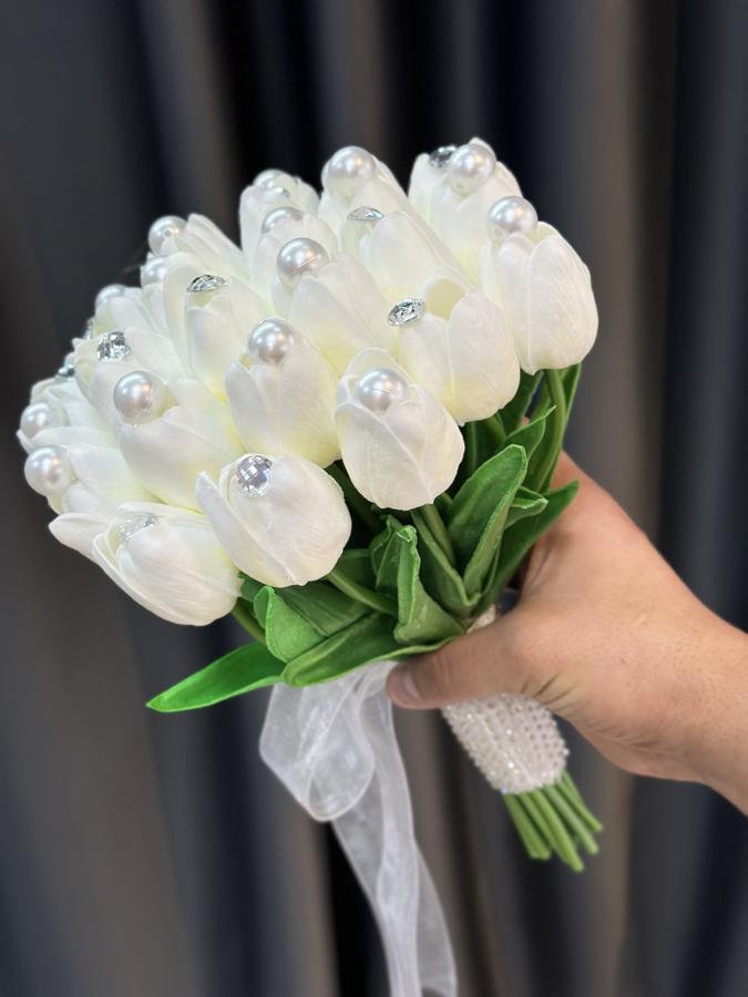 ıslak yapay lalelerden yapılmış. Damat yaka çiçeği hediyemizdir .