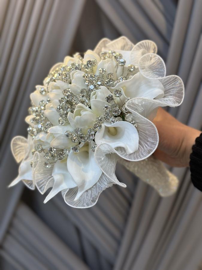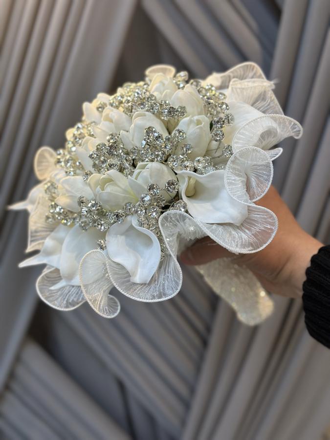 Yapay ıslak galadan yapılmıştır . 25 adet gala vardır bukette . Damat yaka çiçeği hediyemizdir .