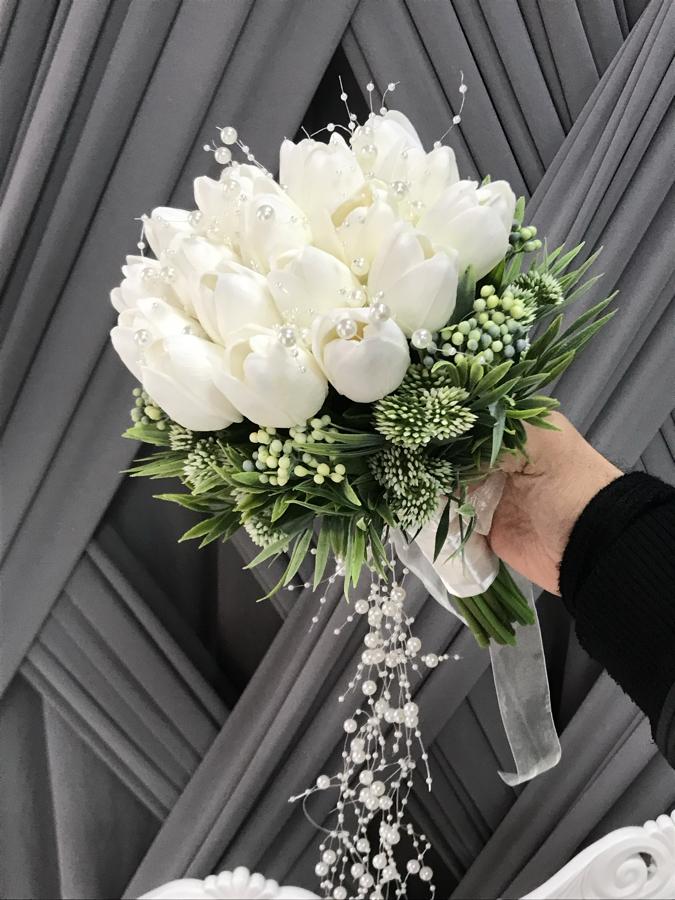 Bukette 18 adet ıslak lale vardır . Yanında Damat yaka çiçeği hediyemizdir . Laleler Islak dokulu olduğundan zamanla sararma yapmaktadırlar . Tarihinize 15-20 gün kala sipariş verilmesi önerilir .